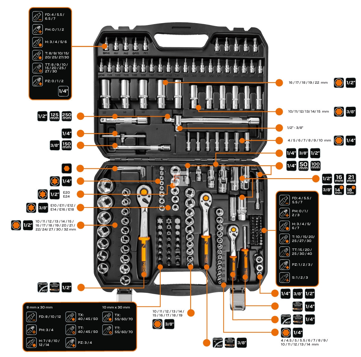 Zestaw kluczy 182 szt. 10-074 marki NEO to profesjonalny zestaw kluczy nasadowych, nasadek i akcesoriów w rozmiarach ½”, ¼” i 3/8”, oferowanych w wygodnej walizce z tworzywa sztucznego z ergonomicznym uchwytem. Pełen pakiet narzędziowy składa się z 182 wysokiej jakości elementów, wykonanych ze stali chromowo-wanadowej z nowego rodzaju rękojeściami. Zestaw zawiera: nasadki sześciokątne 1/2" 17 szt.: 10, 11, 12, 13, 14, 15, 16, 17, 18, 19, 20, 21, 22, 24, 27, 30, 32 mm; nasadki długie sześciokątne 1/2” 5 szt.: 16, 17, 18, 19, 22 mm; nasadki do świec 1/2” 16 mm i 21 mm; nasadki E 1/2” 2 szt.: E20, E24; przedłużki 1/2” 2 szt.: 125mm i 250mm; przegub uniwersalny 1/2”, 1 szt.; adapter 1/2” – 3/8”, 1 szt.; uchwyt do bitów 1/2” x 10 mm; grzechotka 1/2", 90 zęby; nasadki sześciokątne 3/8” 10 szt.: 10, 11, 12, 13, 14, 15, 16, 17, 18, 19 mm; nasadki sześciokątne długie 3/8” 6 szt. 10, 11, 12, 13, 14, 15 mm; nasadki E 3/8” 6 szt.: E10, E11, E12, E14, E16, E18; nasadki do świec 3/8” 2 szt.: 14 mm (dwunastokątna) i 18 mm (sześciokątna); przedłużka 3/8” 150 mm; przegub uniwersalny 3/8”; uchwyt do bitów 3/8” x 8 mm; grzechotka 3/8", 90 zęby; nasadki sześciokątne 1/4" 13 szt.: 4, 4.5, 5, 5.5, 6, 7, 8, 9, 10, 11, 12, 13, 14 mm; nasadki sześciokątne 1/4” długie 7 szt.: 4, 5, 6, 7, 8, 9, 10 mm; nasadki E 1/4", 5 szt.: E4, E5, E6, E7, E8; przedłużki 1/4” 2 szt.: 50 mm i 100 mm; uchwyt wkrętakowy 1/4”; pokrętło typu T 1/4”; uchwyt do bitów 1/4” nasadkowy; przegub uniwersalny 1/4”; grzechotka 1/4", 90 zęby; bity na nasadkach 1/4” 30 szt.: H3, H4, H5, H6, FD4, FD5.5, FD6.5, FD7, PH0, PH1, PH2, PZ0, PZ1, PZ2, T8, T9, T10, T15, T20, T25, T27, T30, TT8, TT9, TT10, TT15, TT20, TT25, TT27, TT30; końcówki wkrętakowe 30 szt.: FD4, FD5.5 (x2), FD7, T10, T15, T20, T25, T27, T30, PH0, PH1, PH2, PH3, PZ1, PZ2, PZ3, S1, S2, S3, TT15, TT20, TT25, TT30, TT40, H3, H4, H5, H6, H7; końcówki wkrętakowe 10 mm x 30 mm, 6 szt.: TX55, TX60, TX70, TT55, TT60, TT70; końcówki wkrętakowe 8 mm x 30 mm, 18 szt.: TX40, TX45, TX50, TT40, TT45, TT50, PH3, PH4, PZ3, PZ4, FD8, FD10, FD12, H7, H8, H10, H12, H14; klucze sześciokątne 7 szt.: 1.27, 1.5, 2, 2.5, 3, 4, 5 mm. Walizka posiada praktyczną wkładkę z gąbki, zapobiegającą przemieszczaniu się narzędzi. Wysoką jakość zestawu potwierdza 25-letnia gwarancja oraz międzynarodowy certyfikat TÜV. Pakiet dla wszystkich użytkowników, którym zależy na posiadaniu możliwie najszerszego asortymentu nasadek.