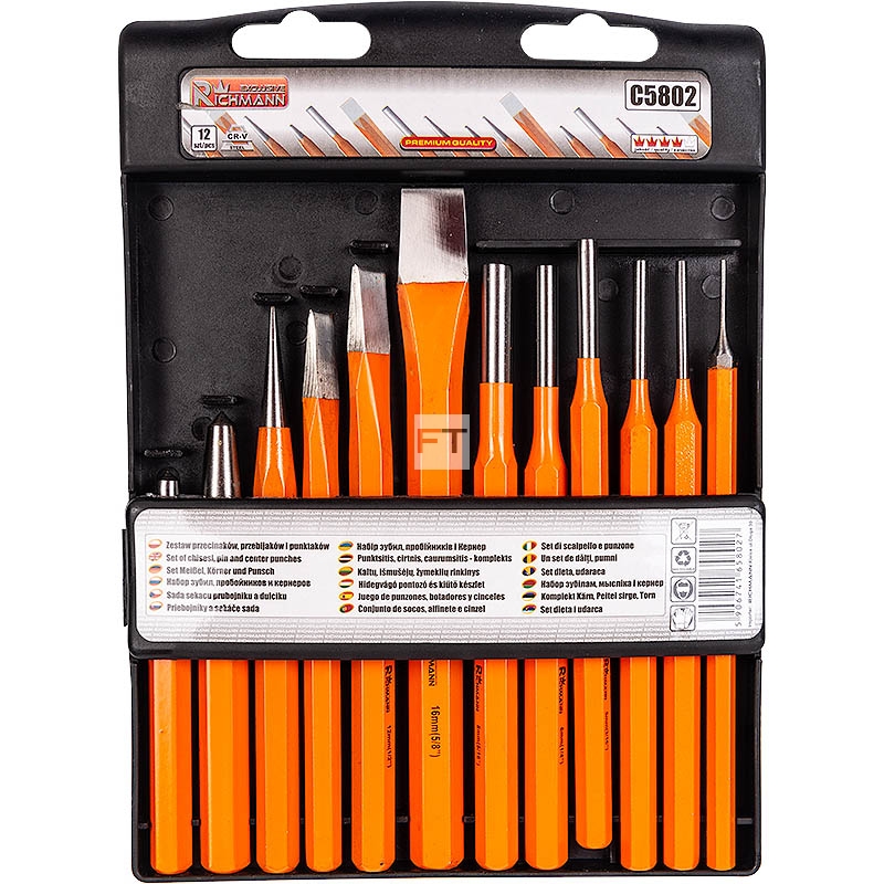 Zestaw umieszczony w praktycznym etui na zatrzask ułatwiającym przechowywanie ze względu na uporządkowane miejsca na każdy przebijak z możliwością zawieszenia zestawu na haku np. w warsztacie.