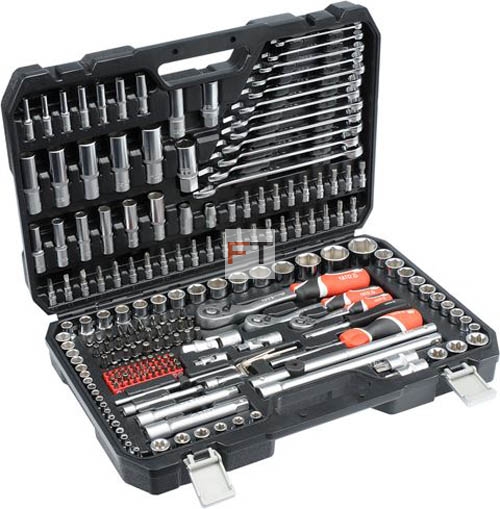 Profesjonalny zestaw narzędziowy, który został opracowany pod kątem potrzeb wyspecjalizowanych serwisów samochodowych i mechanicznych. Klucze nasadowe, jak i napęd nasadek, zostały wykonane z wytrzymałej, narzędziowej stali chromowo-wanadowej CrV 50BV3. Nasadki wykonano metodą kucia matrycowego, a przed procesem hartowania poddano je kalibracji za pomocą precyzyjnych przymiarów i urządzeń kontrolnych. Nasadki wyposażone w system AS-Drive, zwiększający maksymalny moment o 25%, przy pełnej ochronie obrzeży nakrętek, nasadki z dwutonowym wykończeniem powierzchni. W skład zestawu wchodzą również bity wykonane z twardej stali S2. Zestaw umożliwia pracę wymagającą bardzo dużych obciążeń i precyzji, pozwala wykonywać wiele czynności serwisowych związanych z odkręcaniem i przykręcaniem połączeń gwintowych o różnych rozmiarach nominalnych. Grzechotki posiadają trójkomponentową rękojeść oraz 72 zęby (skok roboczy 5 stopni).